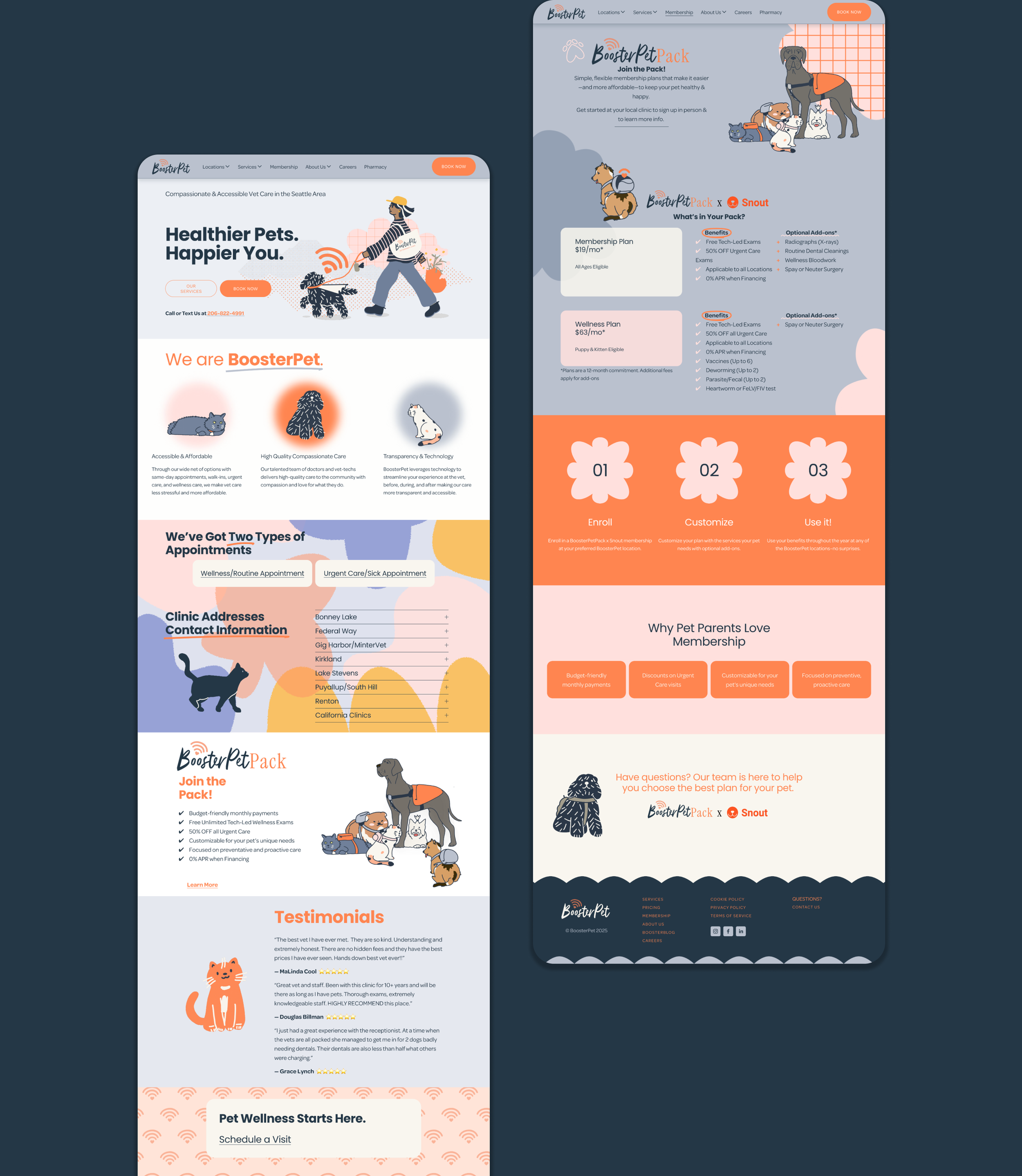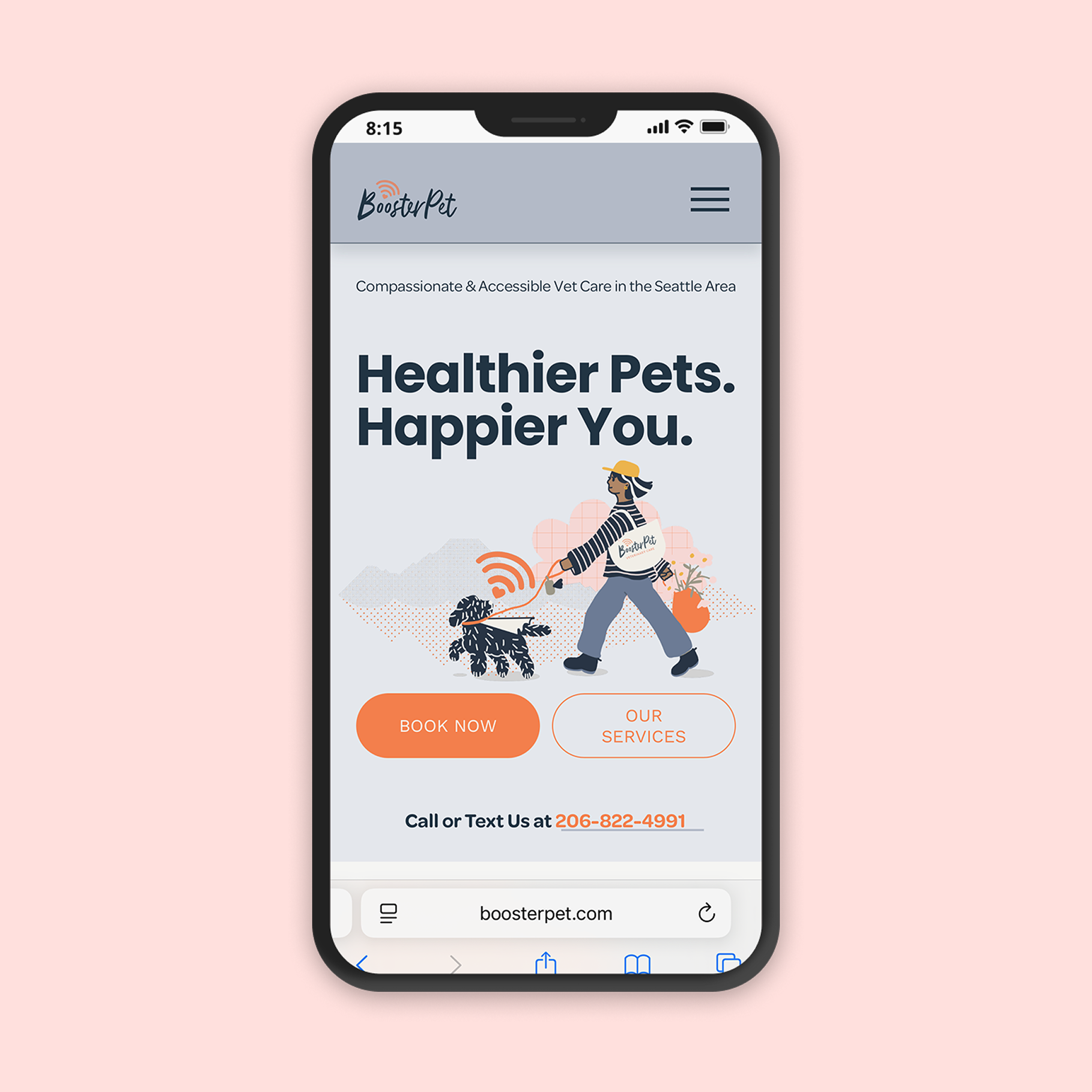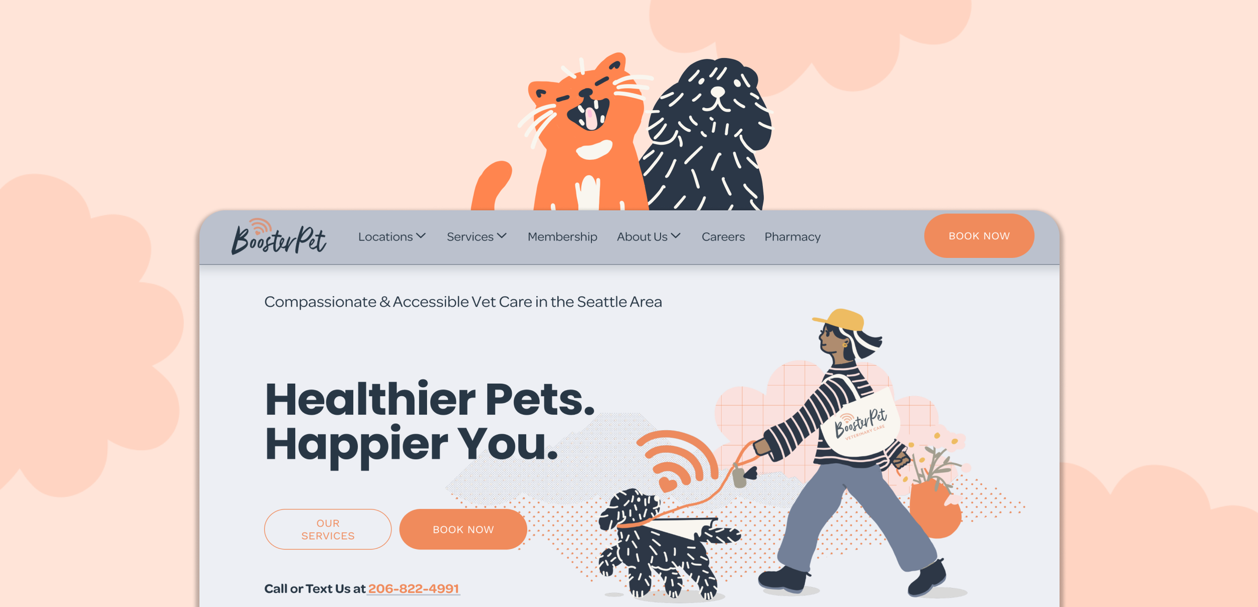 Seattle-based BoosterPet Veterinary Care asked me to redesign their website and update their branding to create a more distinctive and consistent brand presence. They asked for a friendly, professional website that was still recognizable with their current brick-and-mortar branding. After collecting feedback from their team, I created a simple cohesive website structure with a series of custom illustrations and motion graphics to engage users.
