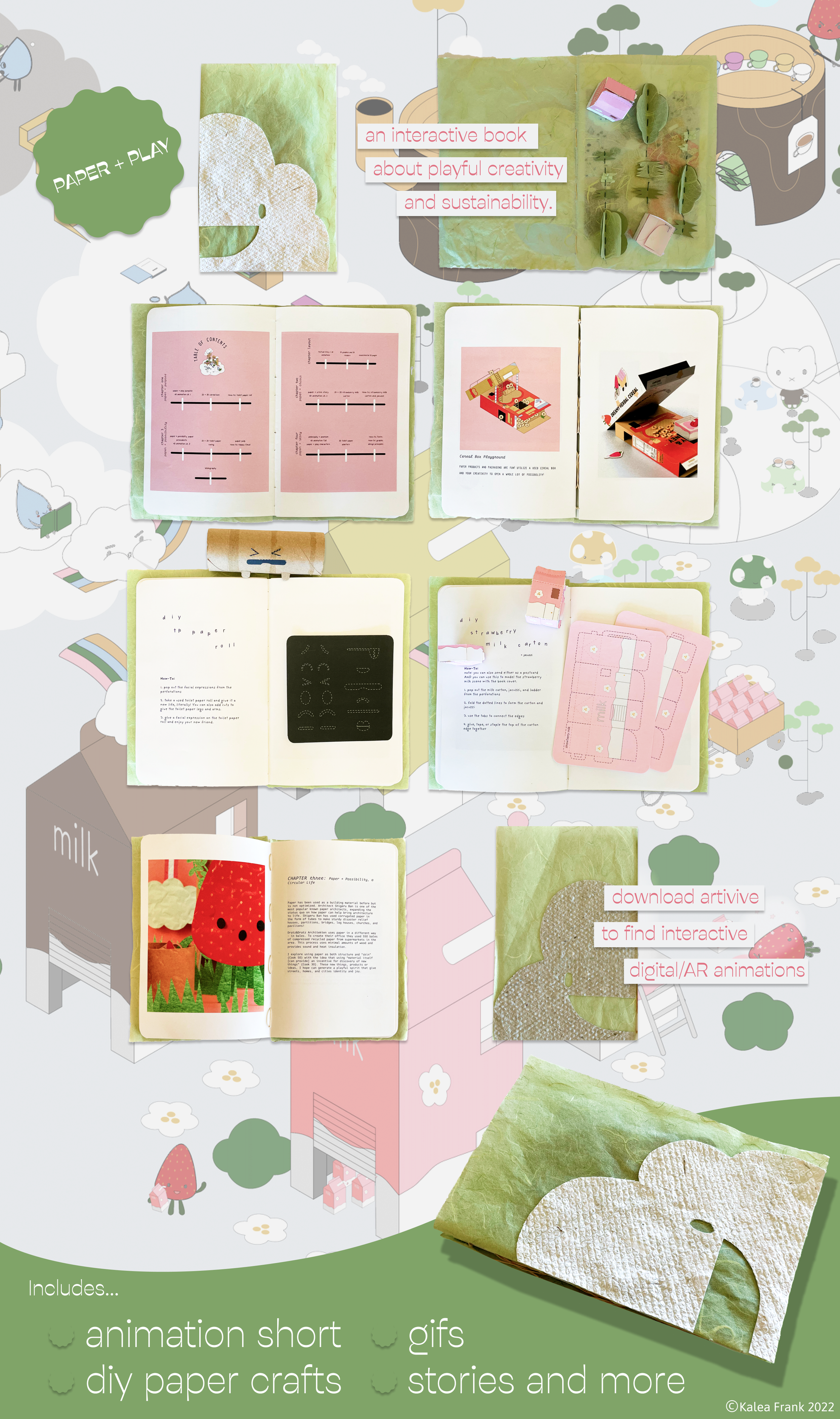 Paper + Play is an interactive book with animations exploring the joy of paper and its real impact on the environment. It encourages readers to repurpose paper creatively through colorful illustrations, DIY activities, and Augmented Reality using the Artivive app. The book unfolds like a set, revealing animations that bring its story to life, inspiring hands-on and digital creation. A special section covers graphic design principles, including isometric drawings and custom fonts.